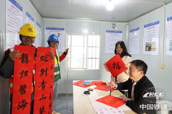 “曾書記,幫我寫一個大‘?!?,我要貼在宿舍門上?!眮碜再F州的鋼筋工安祥君說。為了配合樁基施工,他和貴州的工友們堅守崗位,每天要制作20個鋼筋籠,確保項目施工進度。本次活動送出福字、春聯40多幅,為堅守崗位的建設者們營造出歡樂祥和的新春氛圍。